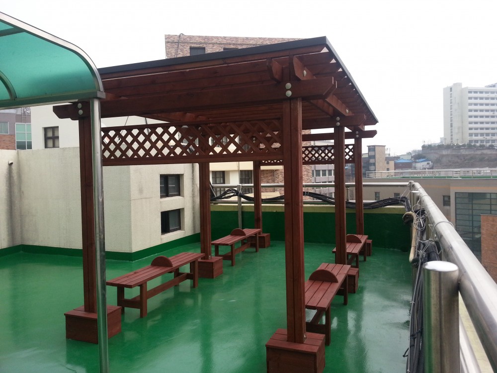 튼튼한 목재 파고라 구조물 아래에는 편안한 곡선형 등받이가 있는 벤치가 여럿 배치되어 있어, 소규모 그룹 활동이나 개인 휴식에 모두 적합합니다. 바닥은 방수 처리된 녹색 데크로 마감되어 시각적으로 안정감을 주며, 미끄럼 방지 효과도 고려된 마감입니다.